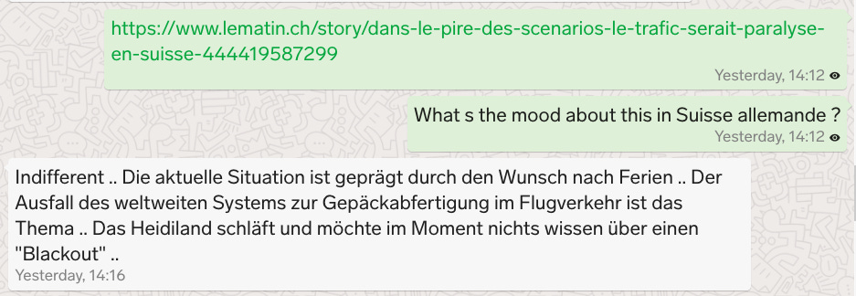 no commentsno comments #019Sur l’indifférence (?) d’une partie de la population suisse plus préoccupée par la panne du système mondial de traitement des bagages dans le trafic aérien ... que par le risque de blackout. Jul 04, 2022∙ PaidShareThis post is for paid subscribersSubscribeAlready a paid subscriber? Sign in
