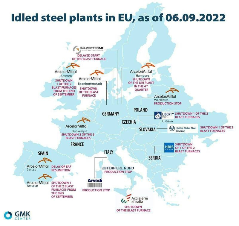 Quinze usines européennes ont suspendu ou envisagent de suspendre leur production d'acier