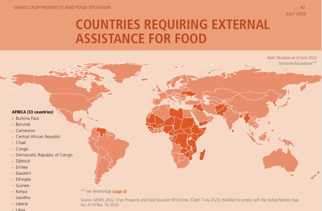 La FAO estime qu'au niveau mondial 46 pays, dont 33 en Afrique, 10 en Asie, deux en Amérique latine et les Caraïbes, et un pays en Europe, ont besoin d'une aide extérieure pour l'alimentation.