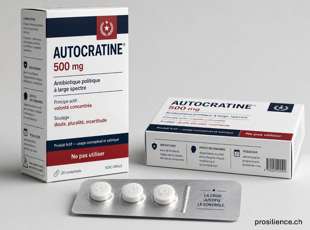 Un comprimé fictif contre les effets secondaires de la liberté : le doute, la pluralité, l’incertitude, la contradiction. Autocratine® 500 mg - un antibiotique politique à large spectre - promettrait l’ordre immédiat, la certitude confortable et le soulagement rapide face à la complexité du monde.