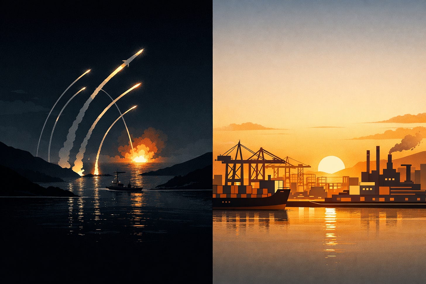 The defining image of this century may be simpler than most theories allow. In one theater, a superpower expends million-dollar interceptors over distant seas to protect maritime chokepoints2 from low-cost disruption. In another, its principal rival pours concrete, expands ports, hardens grids, builds rail corridors, scales factories, and thickens the industrial base at home. One side burns surplus to keep a global system moving. The other tries to turn surplus into durable capacity. That is not just a contrast in style. It is a contrast in civilizational logic.